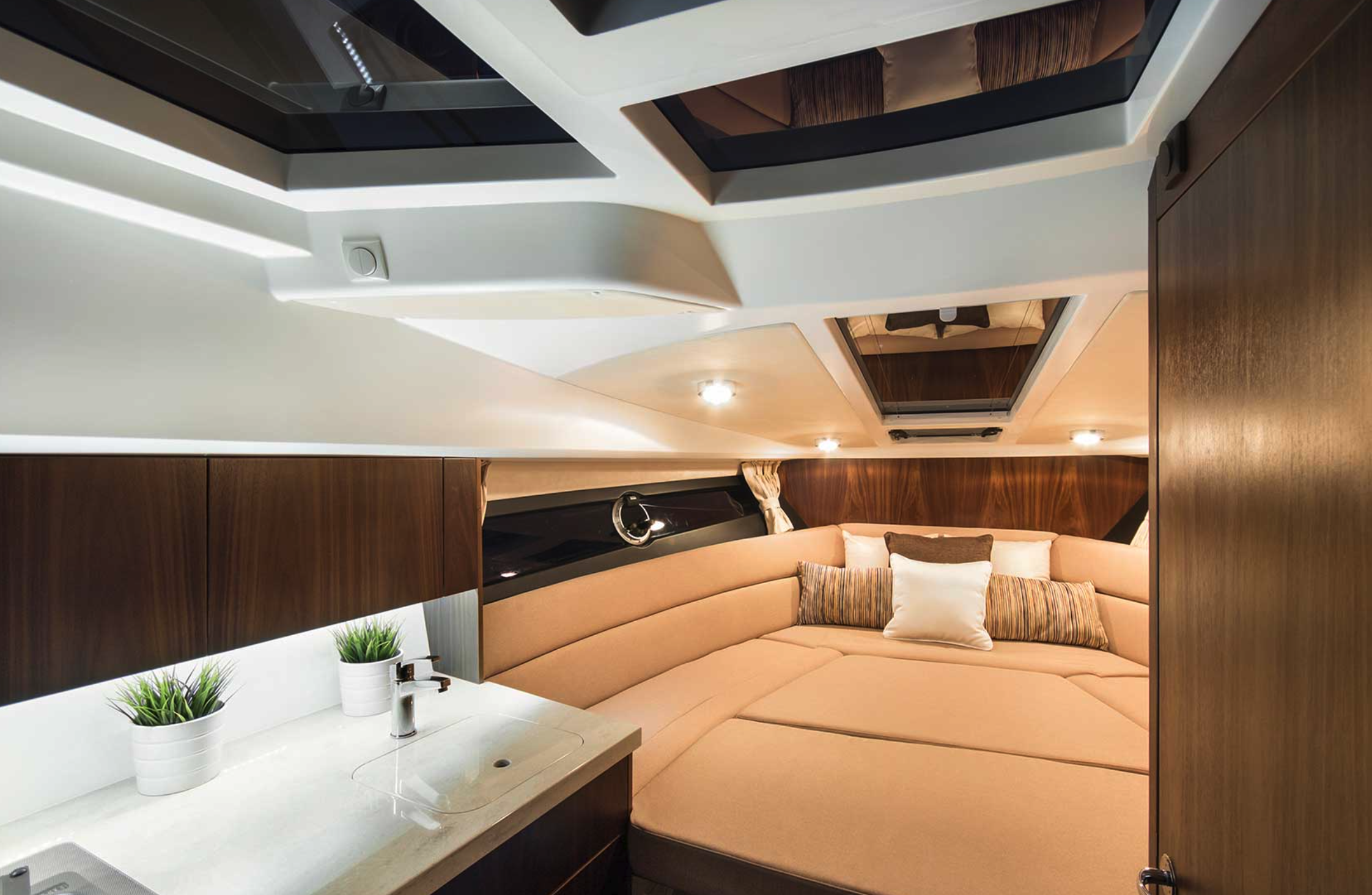 Galeon 305 HTS catches the eye with its thrilling, dynamic exterior and an open deck layout. Come on board to find a generous aft sun pad that doubles as extra storage or find respite in one of the two lounge areas available on the main deck. The manually operated sunroof bathes the interior in natural light – perfect for those sunny summer days.