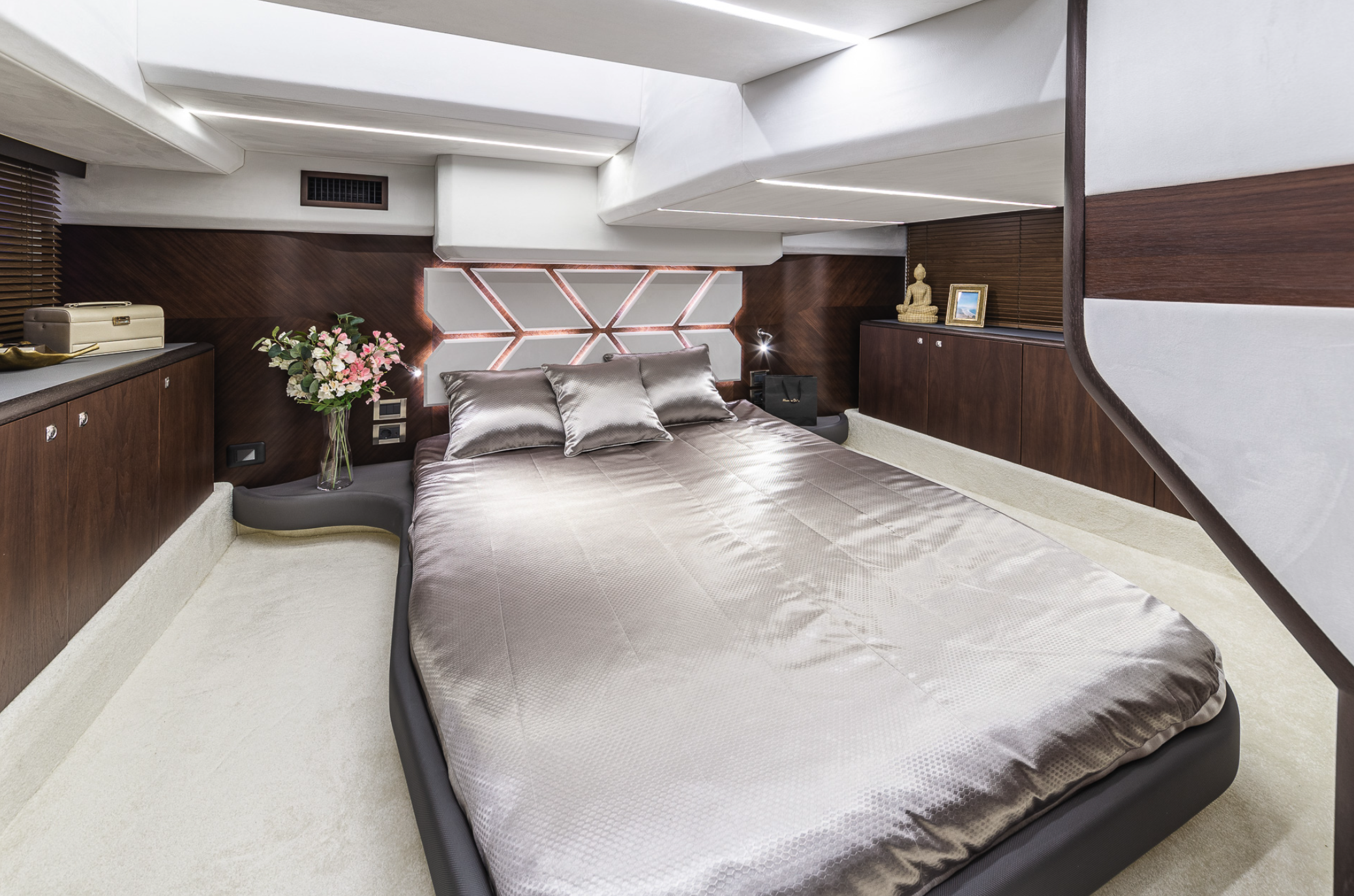 Below deck, guests will find two full-sized cabins, one of which, the owner’s cabin, is situated in the aft. Two separate bathrooms offer extra comfort to the guests. All the cabins are of full standing height and offer additional storage space, ideal for longer cruises.