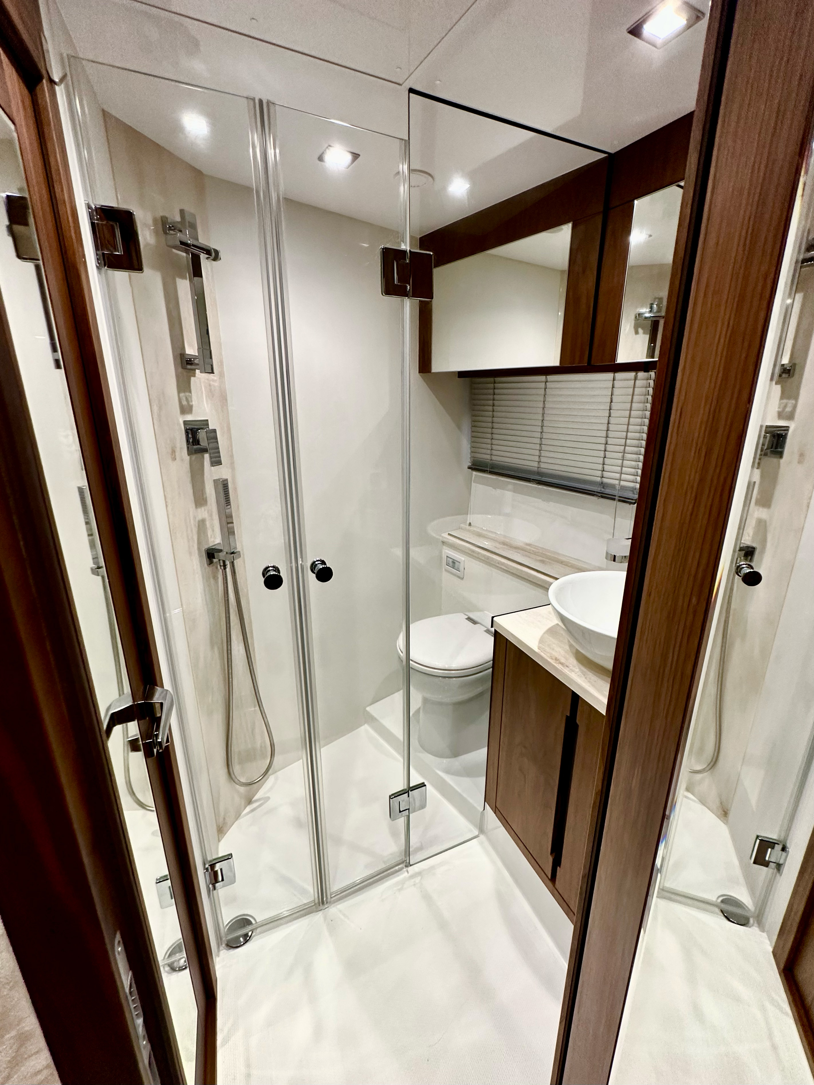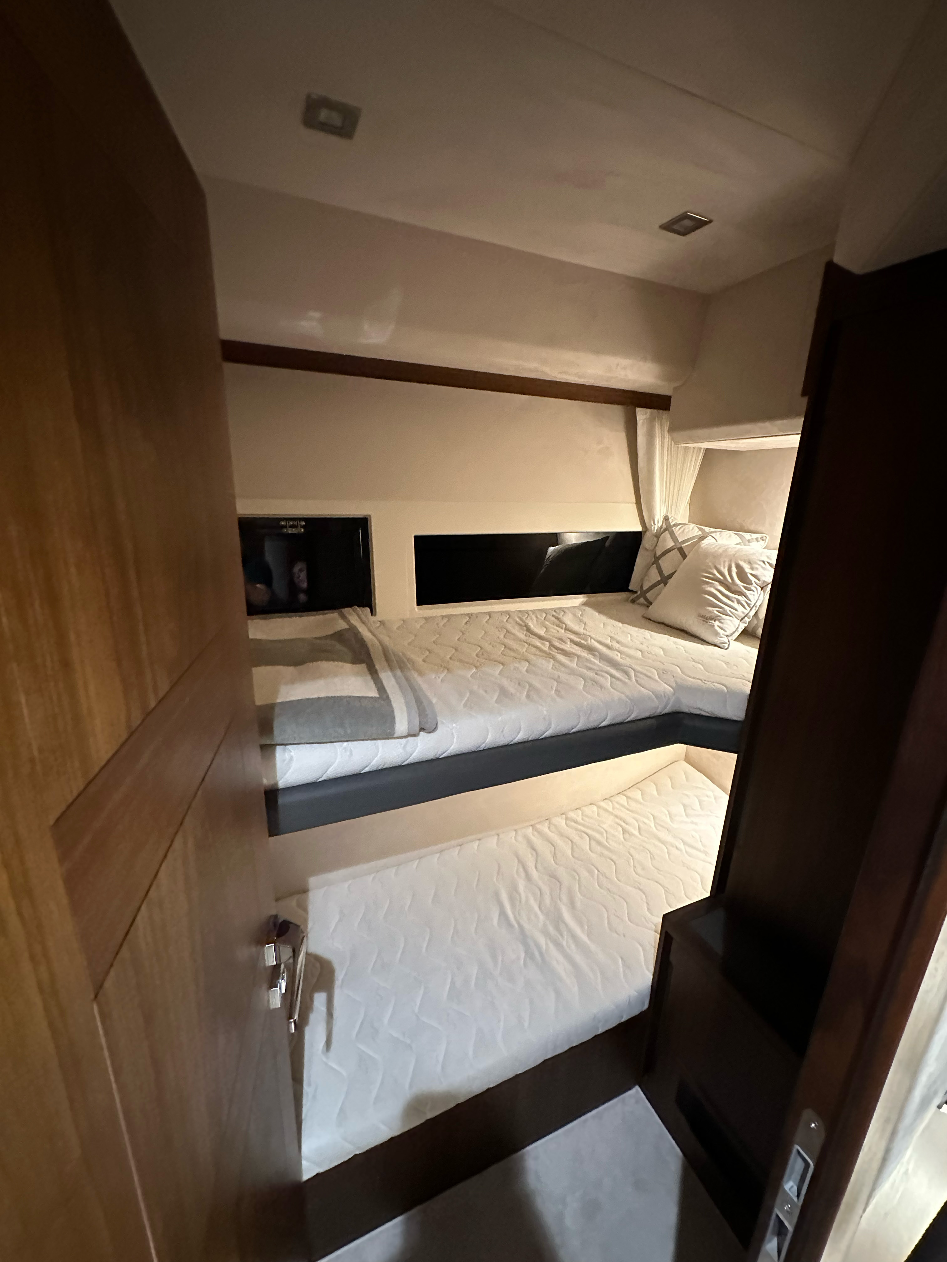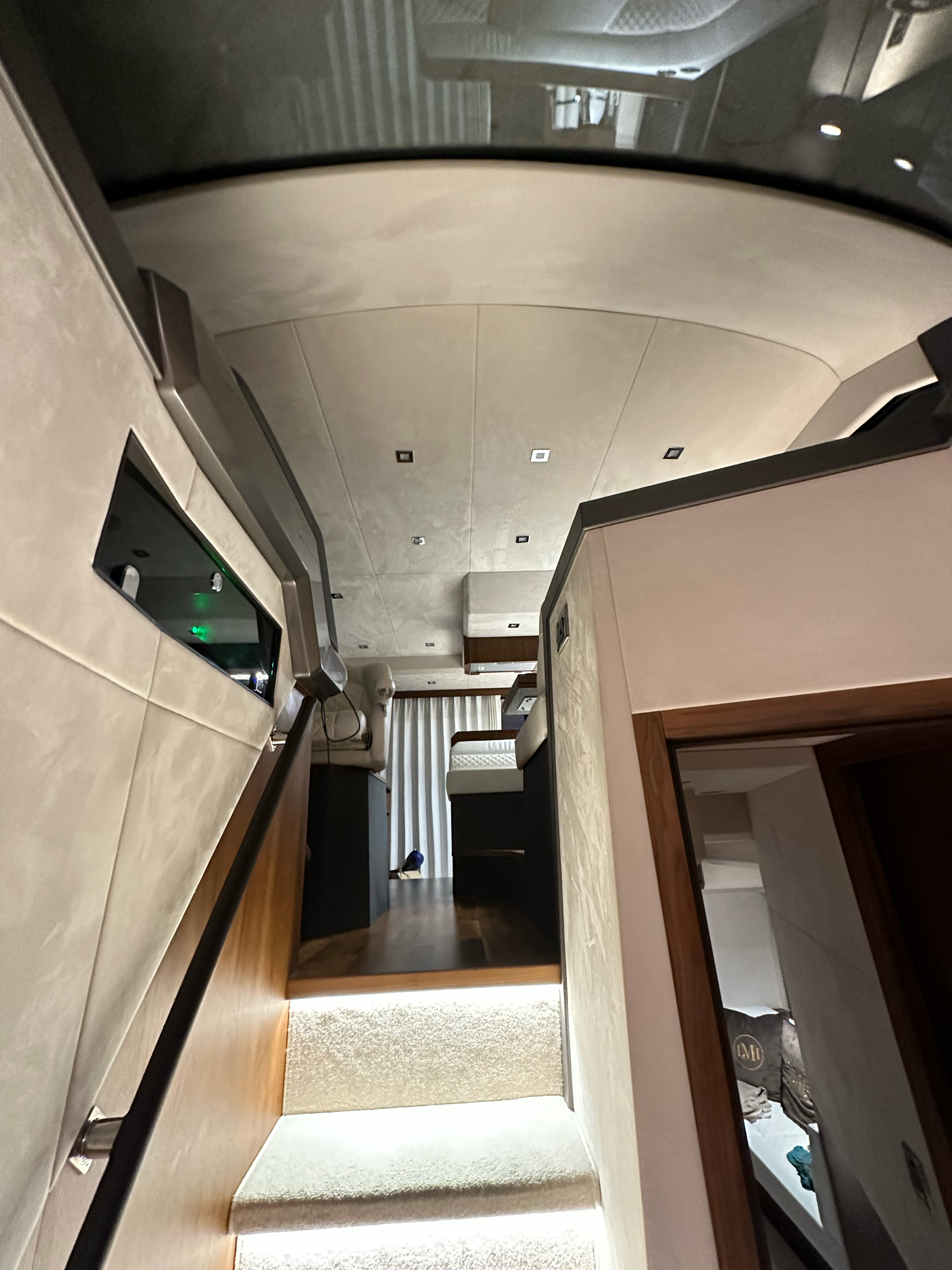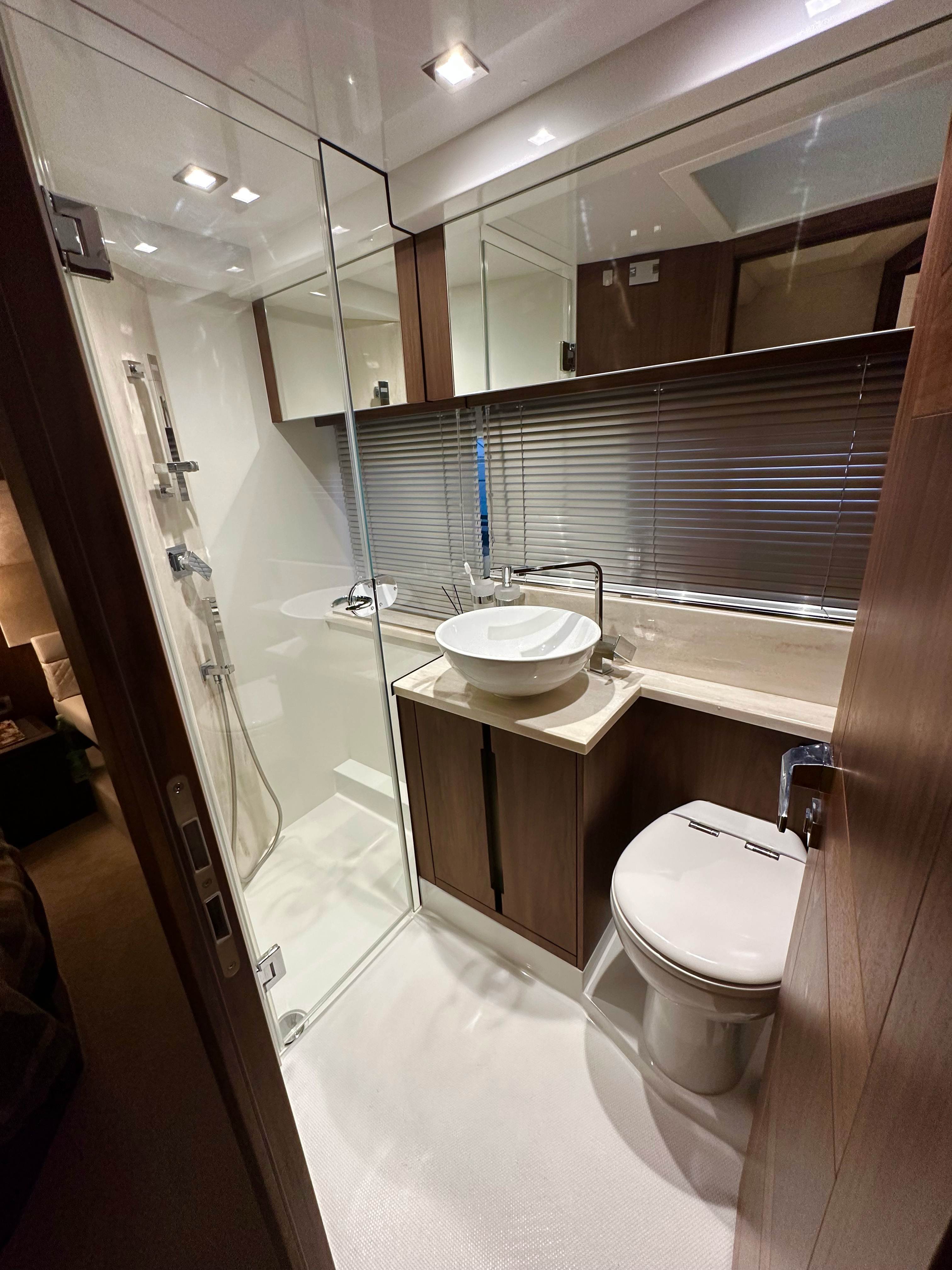 The sleek exterior marks another collaboration with the esteemed Tony Castro Design Studio and is quickly recognizable as it follows the trends set by the fourth generation of Galeon yachts. A unique combination of a dynamic silhouette with sporty accents throughout is complimented by the large windows on both decks that liven up the interior.