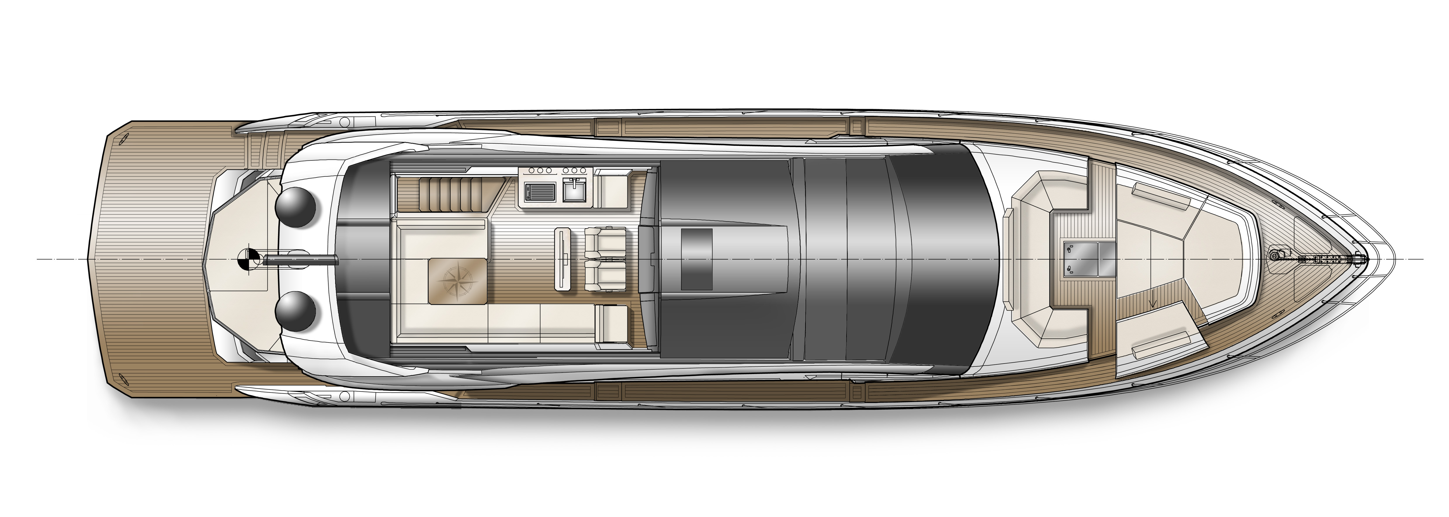 The striking exterior presence and its dynamic profile are staples of the SKYDECK design philosophy which allows for integrating the top deck without compromising the sporty design of the model. Make it even more functional with a lightweight carbon bimini top option for even better protection from the elements.