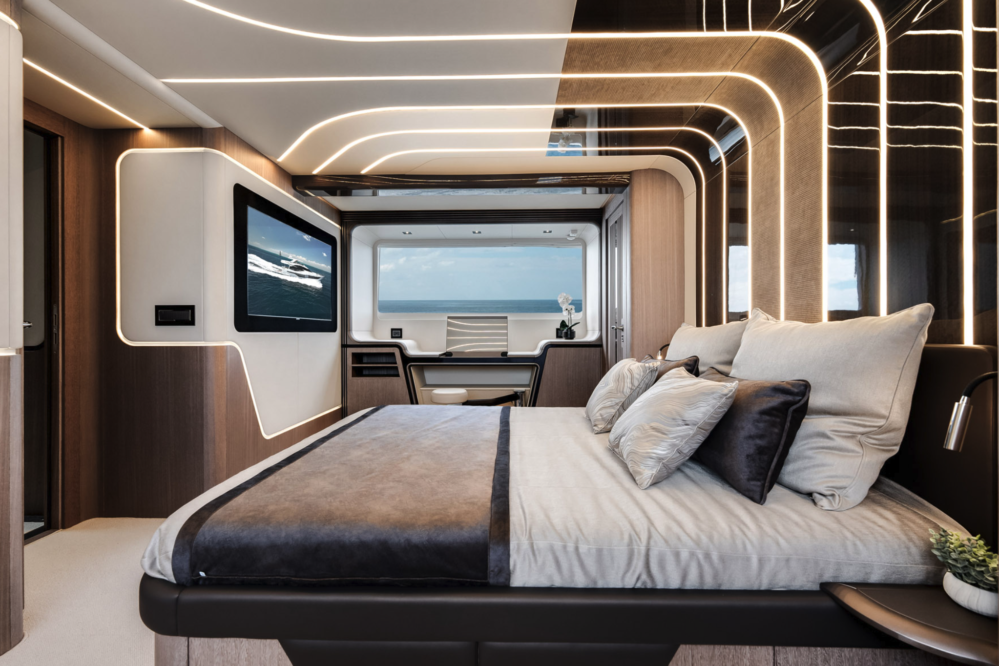 Structure elements made of carbon fiber allowed to increase the surface of the upper deck, so we can offer there not only a double helmsman’s position, fully equipped bar, a comfortable sunbathing area, four tables that can be adapted to the needs of guests, but also two separate, huge, semicircular sofas between which we have integrated very stylishly the jacuzzi. On the main deck, we can enjoy the interiors that bring to mind the best apartments. A richly equipped galley with a refined kitchen island attracts attention. Next to the double helmsman’s station you can find a comfortable sofa with a coffee table, and right next to it, a majestic table for 8 people. The tastefully decorated living room offers, apart from elegant sofas that tempt you to spend a longer time comfortably on them, also unusually large windows, a pull-out TV, a modern bar and a separate day toilet.