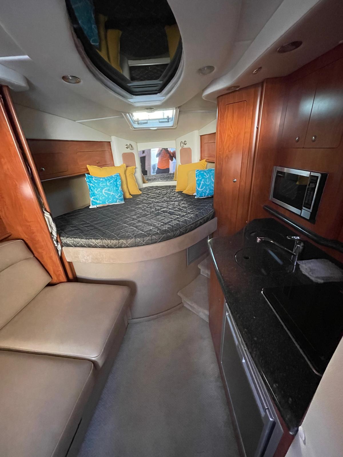 Rinker 310 Express Cruiser, a 31-foot vessel in very clean condition with a comprehensive list of equipment. This cruiser features an extensive electronics package that includes Garmin radar, GPS/plotter, sounder, and VHF radio. Key amenities include Flexi- Teak decking in the cockpit, a full canvas package, and a cockpit summer kitchen with BBQ, blender, and sink. The boat is equipped with air conditioning, heating systems, and an anchor winch with remote control at the helm.